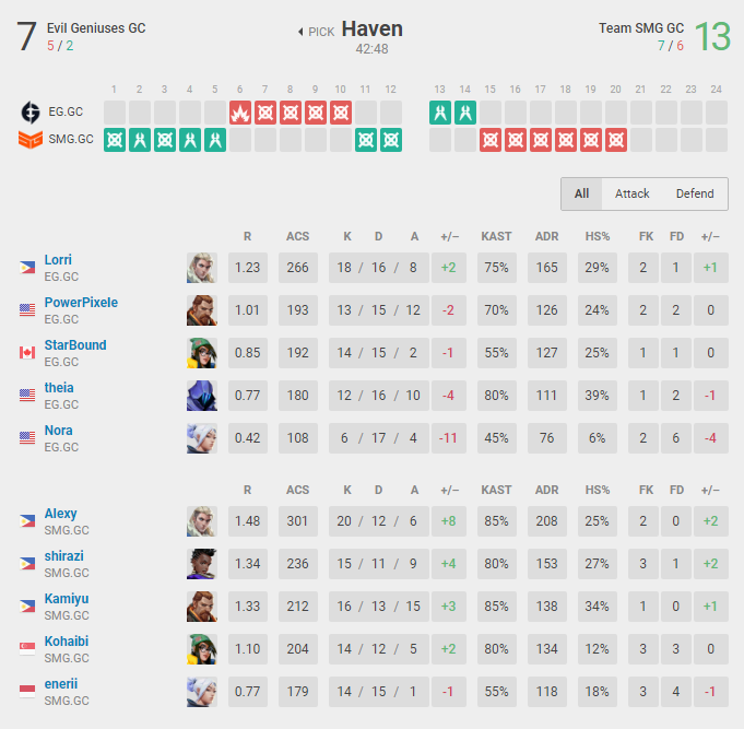 Evil Geniuses GC started their defensive half with a successful pistol round followed by an additional round, but their momentum didn't last long as Team SMG quickly regained control and didn't give the struggling North American side any room to breathe, consistently closing out rounds. SMG secured victory without any issues, winning the next six rounds to finish with a score of 13-7.