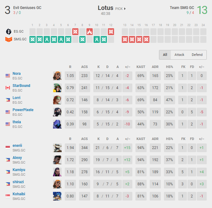 Team SMG began the brighter of the two sides and got off to a commanding 6-0 lead by winning the first pistol round and subsequent gun rounds against Evil Geniuses GC. The Abigail "Kohaibi" Kong-led squad controlled the map effortlessly and capitalized on every mistake their opponents made, ultimately finishing with a 9-3 score advantage. However, any chance of an EG comeback was quickly brushed aside once the teams swapped sides, with Team SMG wasting no time as they posted four rounds on the bounce to take Lotus away, 13-3.