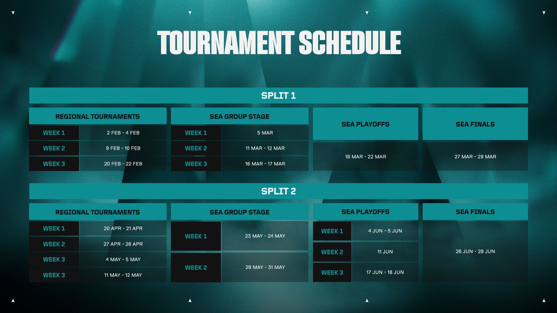 - Phase 4: Playoffs (SEA-wide, double elim)