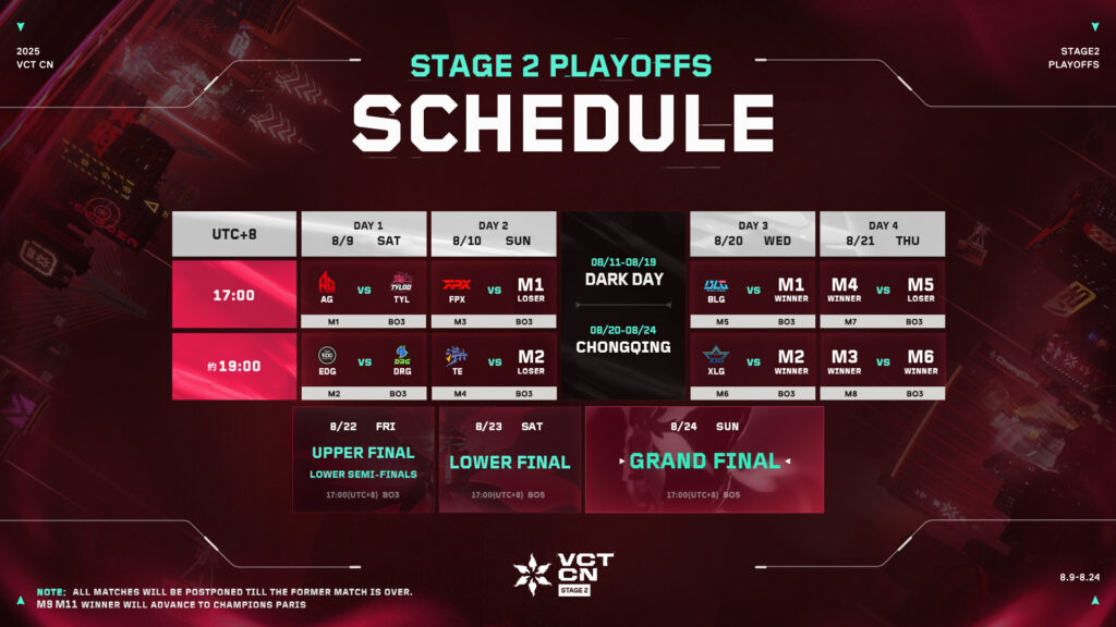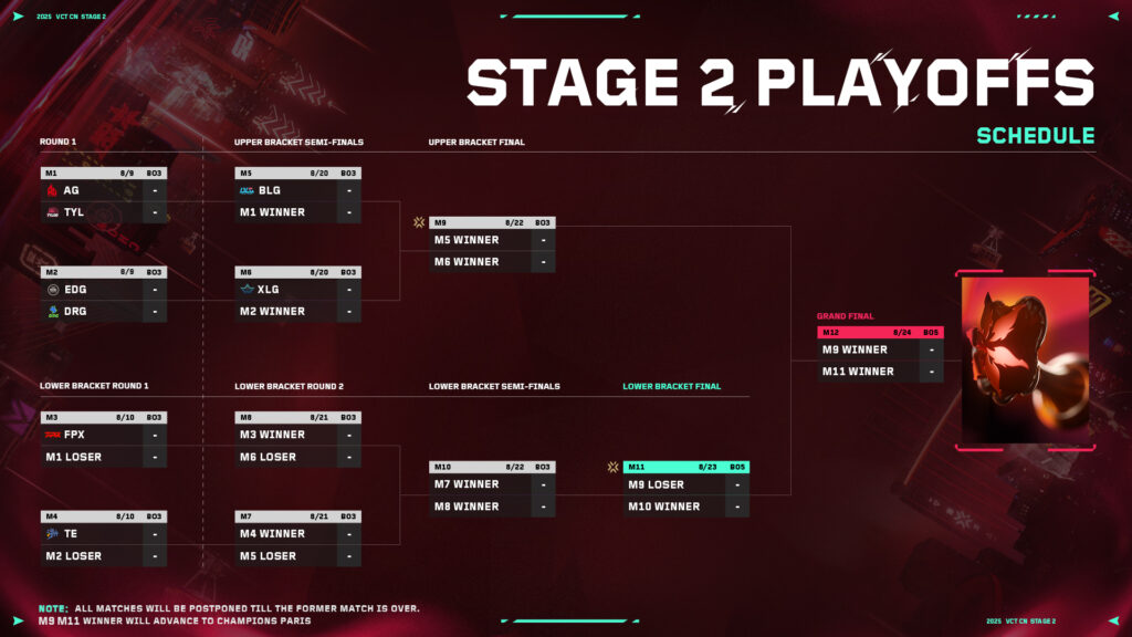 The schedule for the playoffs of VCT CN Stage 2 looks as follows: